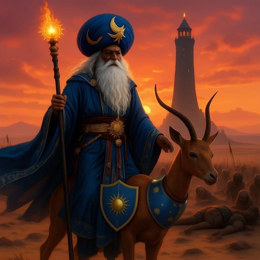 This hyper-realistic image shows Istari Alatar on a giraffe in a savanna battle at sunset. He wields a sun-topped staff, facing a dark tower as orc bodies litter the field.