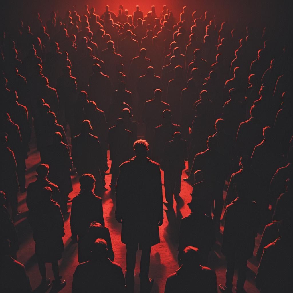 This image shows a solitary person dwarfed by a crowd of identical figures, set against ominous shadows. The scene features a high-contrast, film noir style with gritty textures and dramatic, cinematic lighting.