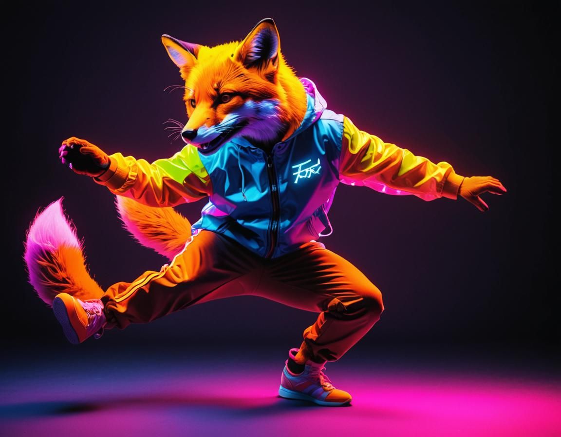 This image shows a breakdancing fox in a black light setting. The fox is wearing neon fluorescent clothing in a pop-art style.