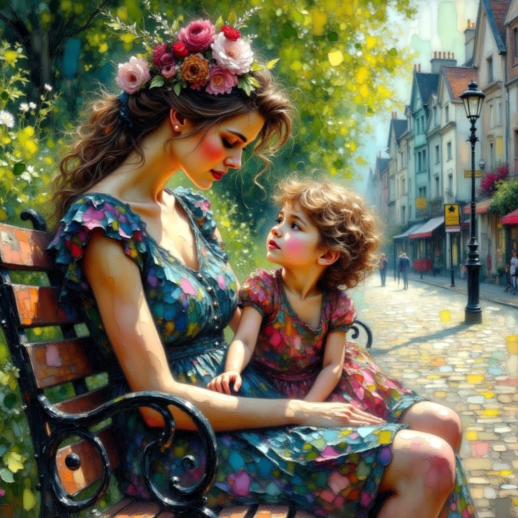 This image shows a beautiful woman comforting a child on a park bench in a quaint UK town square. The artwork is an impasto oil painting with a soft, romantic, colorful, and textured aesthetic.