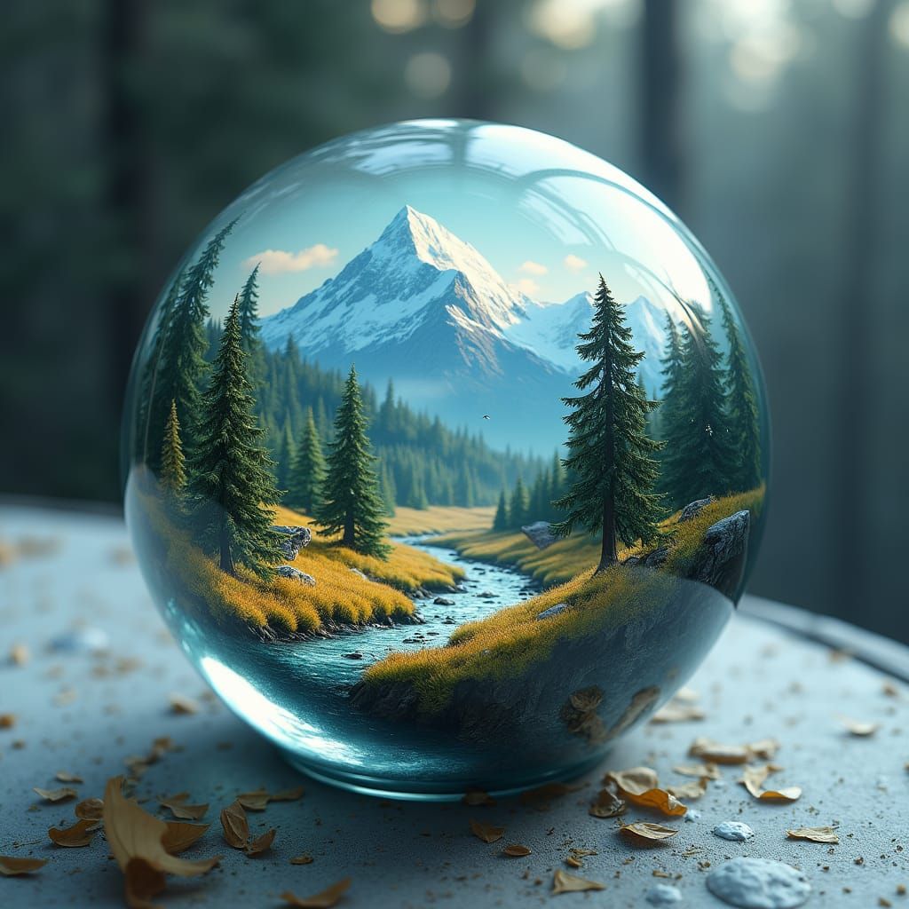 This image depicts a serene, miniature world within a glass ball, featuring a snow-capped mountain, rolling hills, and vast taiga forests, all blended together in a dreamlike landscape with iridescent hues of blue, green, and gold, evoking an ethereal, otherworldly glow.