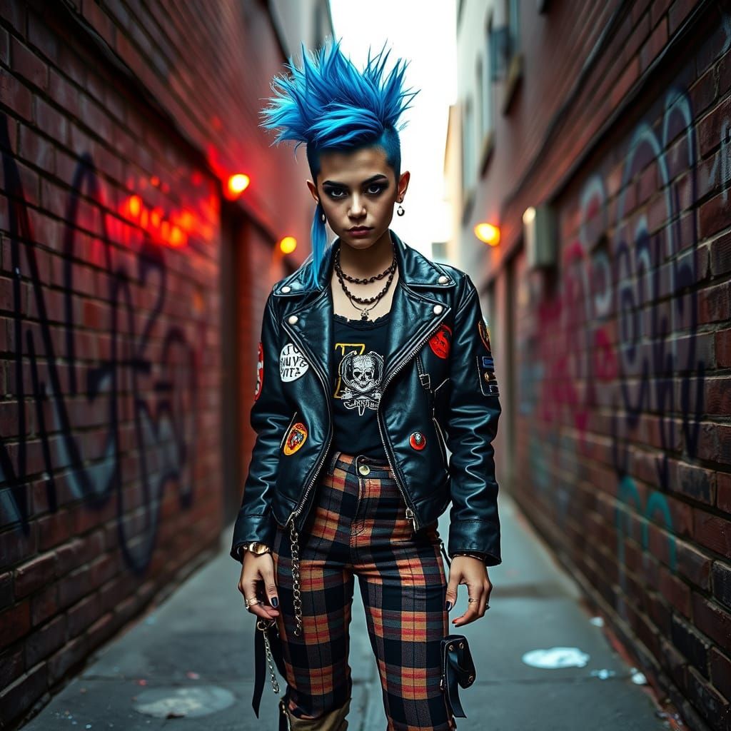 This image shows a confident punk girl with a bright blue mohawk in a graffiti-filled alley. She wears a ripped leather jacket and plaid pants, rendered with bold lines and bright colors.