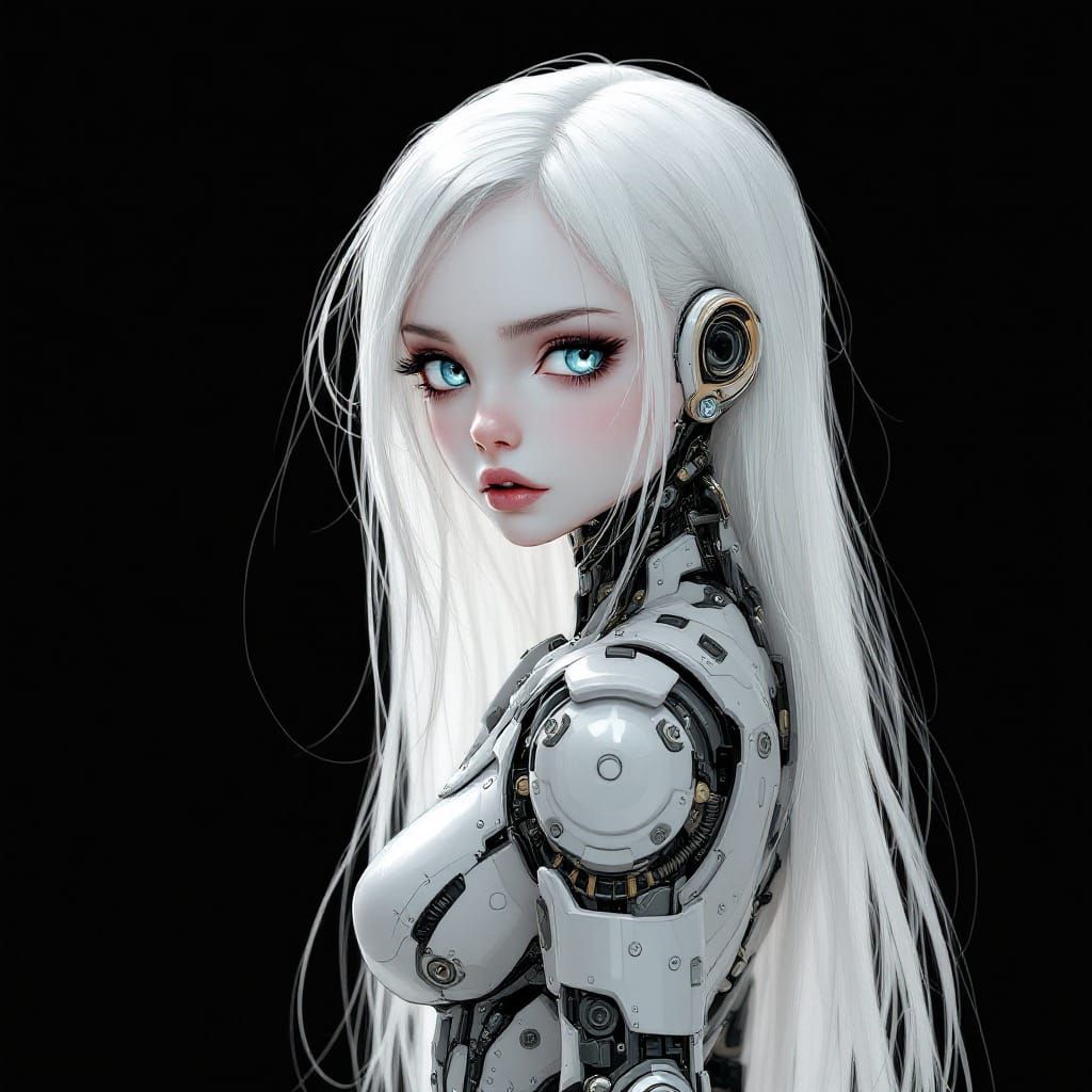 A whimsical digital painting of a petite robot with metallic hair and a guilty look. Features hyper-realistic detail, Rembrandt lighting, and street art elements on a black background.