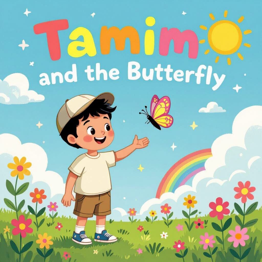 This image shows a cheerful children's book cover illustration. A young boy smiles and reaches out to a butterfly in a vibrant meadow under a sunny sky. The artwork features bold lines and textured illustrations.