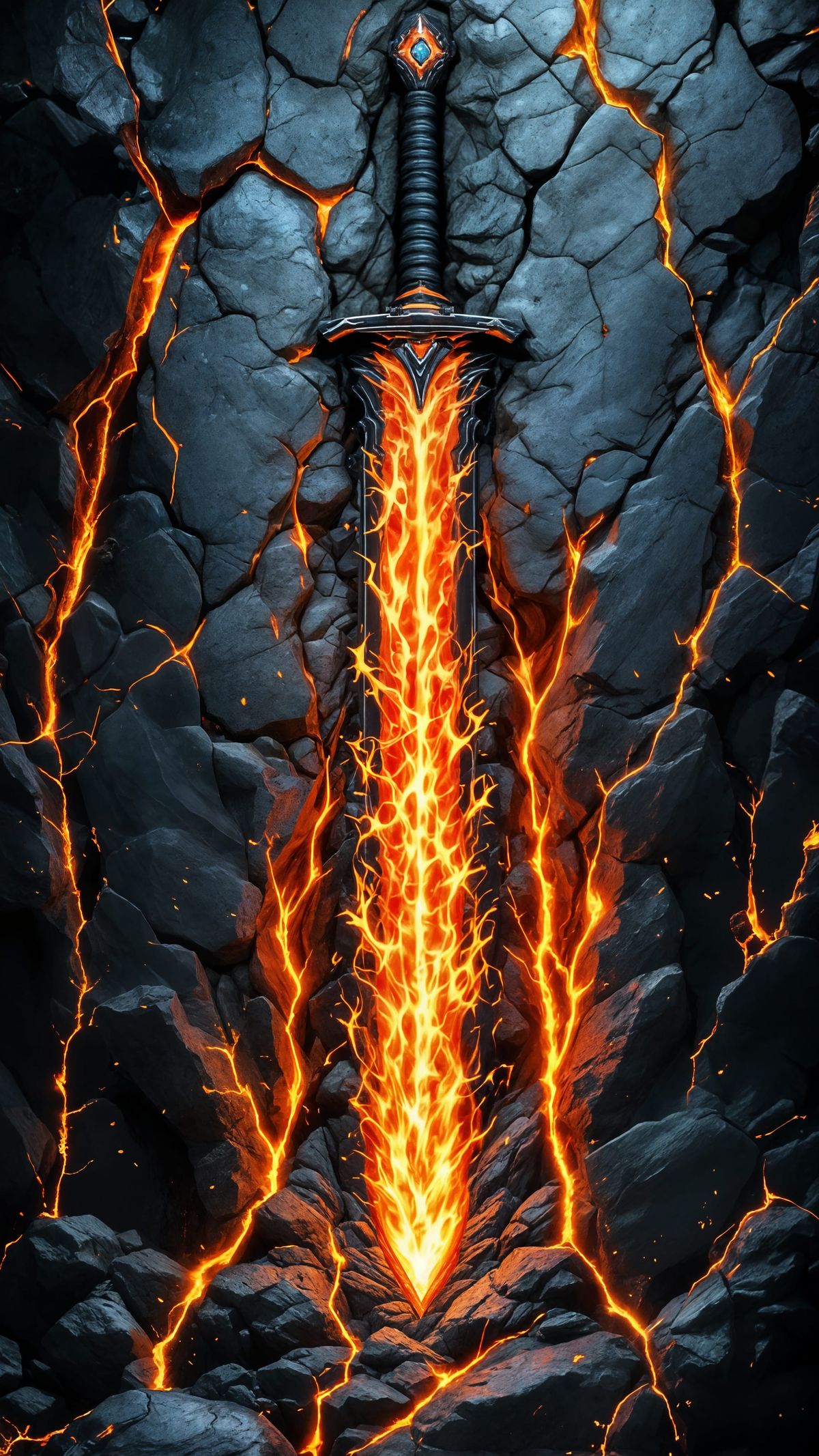 This image shows a fiery katana, its blade melting into a stone that's disintegrating from intense heat. The scene is depicted in a cyberpunk aesthetic