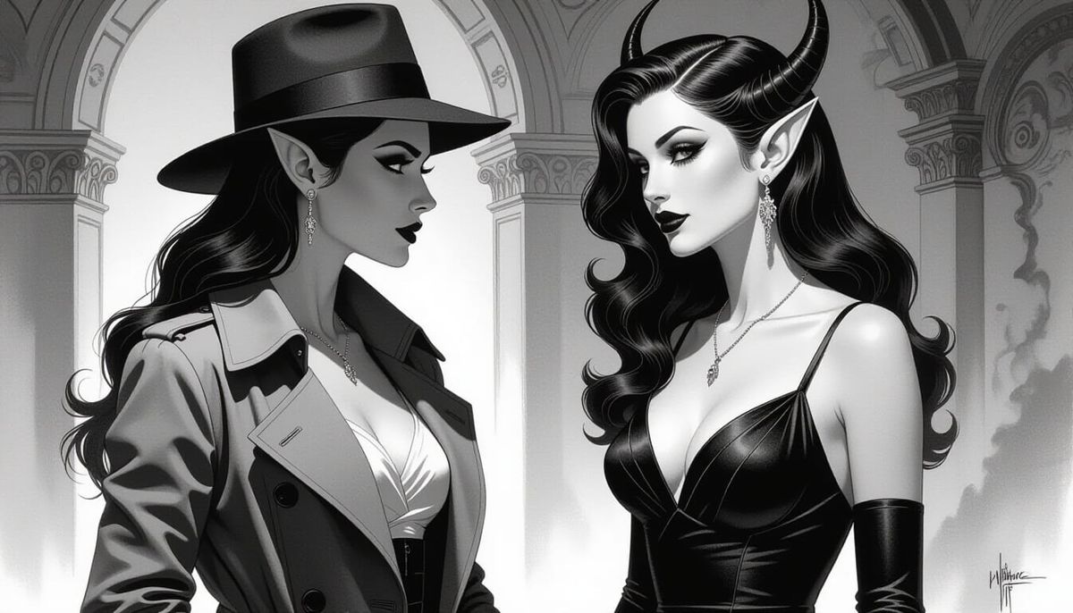 This image depicts an elf detective and a tiefling woman in a 1940s setting, rendered with Renaissance-era detail and dramatic chiaroscuro.