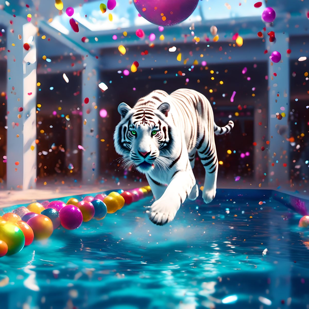 This image shows a white tiger leaping into a swimming pool at a vibrant 1990s-themed party. The scene is rendered in high resolution with sharp focus and realistic skin textures.