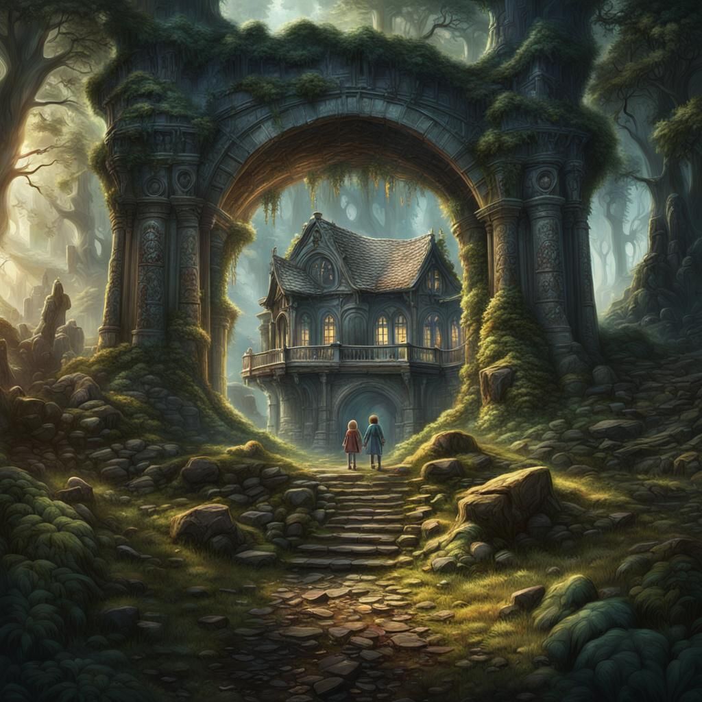 This image shows Hansel and Gretel on an adventure through a forest with old ruins. It's a dramatic digital painting with a maximalist aesthetic.