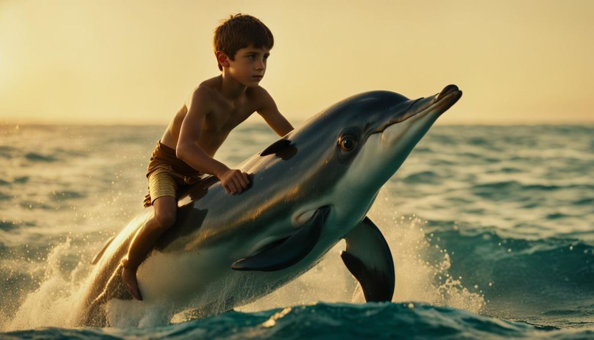 This image shows a sun-kissed young boy from ancient Greece riding a dolphin. The serene scene is bathed in soft golden light, creating a nostalgic and timeless atmosphere, reminiscent of a cinematic film still.