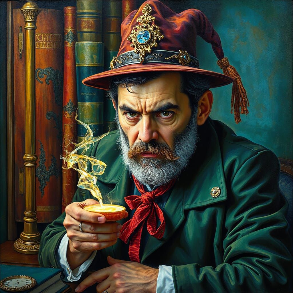 This image shows an angry intellectual in a library, rendered as a detailed oil painting with a subtle 3D effect. The art features intense saturation, glowing outlines, and glossy textures in brown, green, and blue tones.