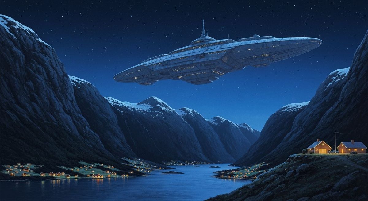 This image depicts a colossal interstellar spaceship arriving in the Norwegian fjords under a magnificent starry night, rendered in a 1970s sci-fi art style.
