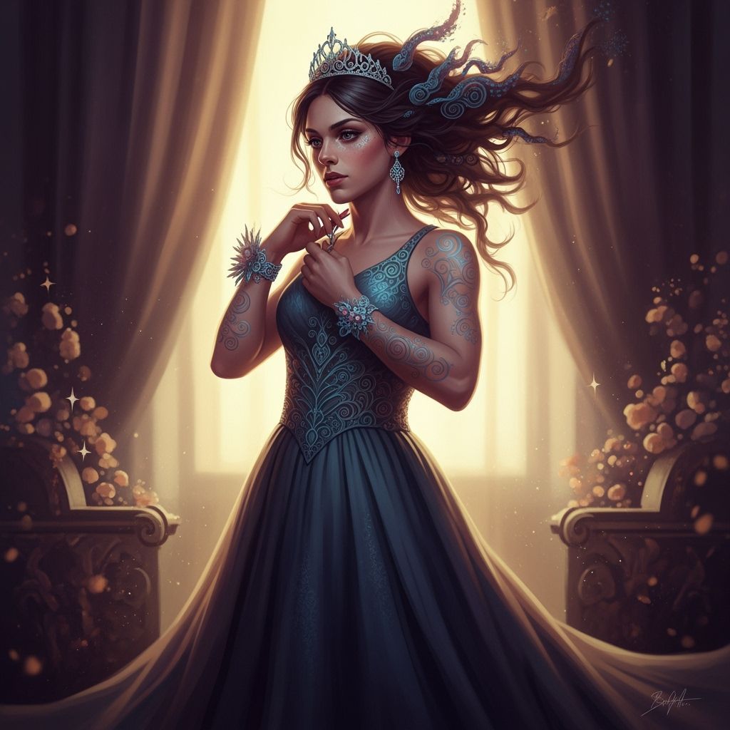A digital painting of a transgender girl preparing for prom in a flowing gown. The artwork features soft lighting, rich colors, and fantasy elements, reminiscent of detailed concept art. The image has an Unreal Engine 5 aesthetic.