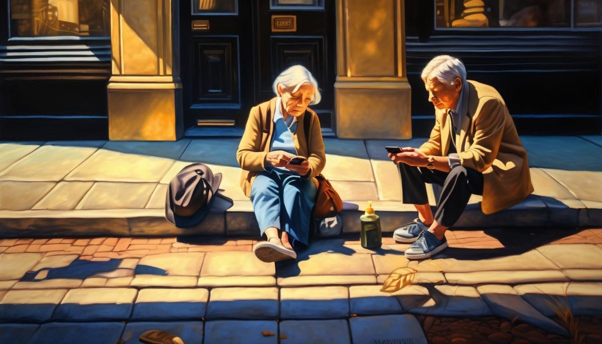 A medium shot oil painting depicts an elderly woman on the sidewalk, being helped by a young woman as a young man films with his phone. The scene is bathed in warm, golden light with dramatic shadows.