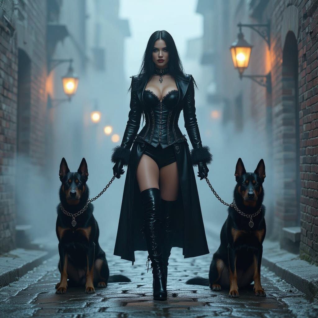 This image shows a gothic woman in a dark alley with two Dobermans. The scene is set at night and filled with fog, creating a cinematic and mysterious atmosphere with dramatic lighting.