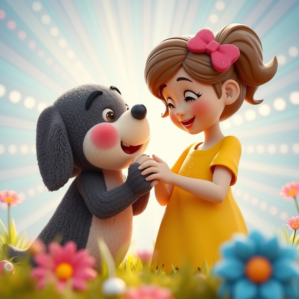 This stunning 3D scene embodies the spirit of kindness, blending whimsy and warmth in a vibrant, stylized environment with intricate details and a bright, shimmering background, reminiscent of Pixar and Disney's signature style.