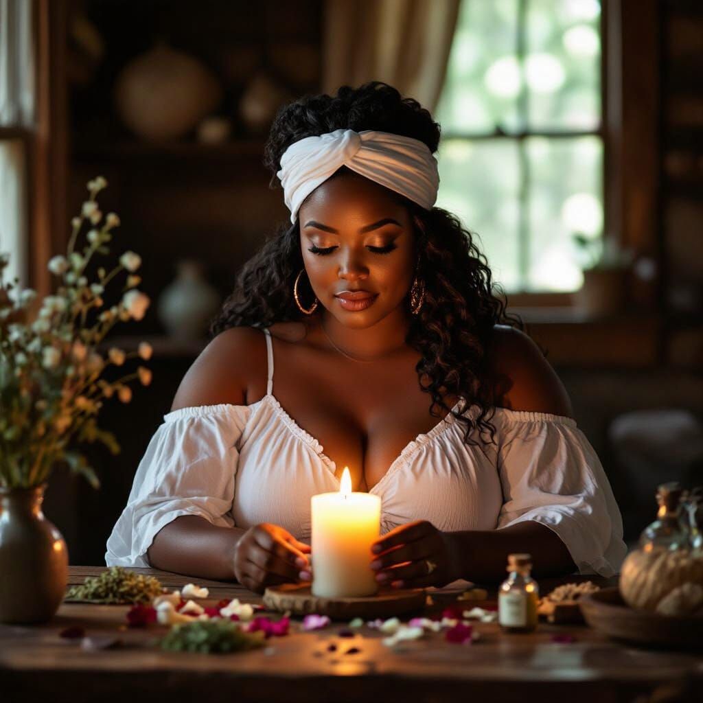 A striking image of a plus-size African American woman in a white dress and headwrap, holding a lit candle for a ritual. The scene is rendered in a rich, painterly style with deep earthy tones.