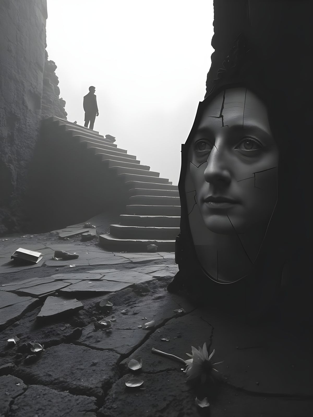 This image shows a hauntingly beautiful landscape of the fragmented soul, where the devil destroys identity and logos consume the true self. A stillness grows, a gentle echo of lost times, amidst endless feeds, fleeting clicks, and shattered dreams. The world fades to monotony, but in the quiet, a voice ...