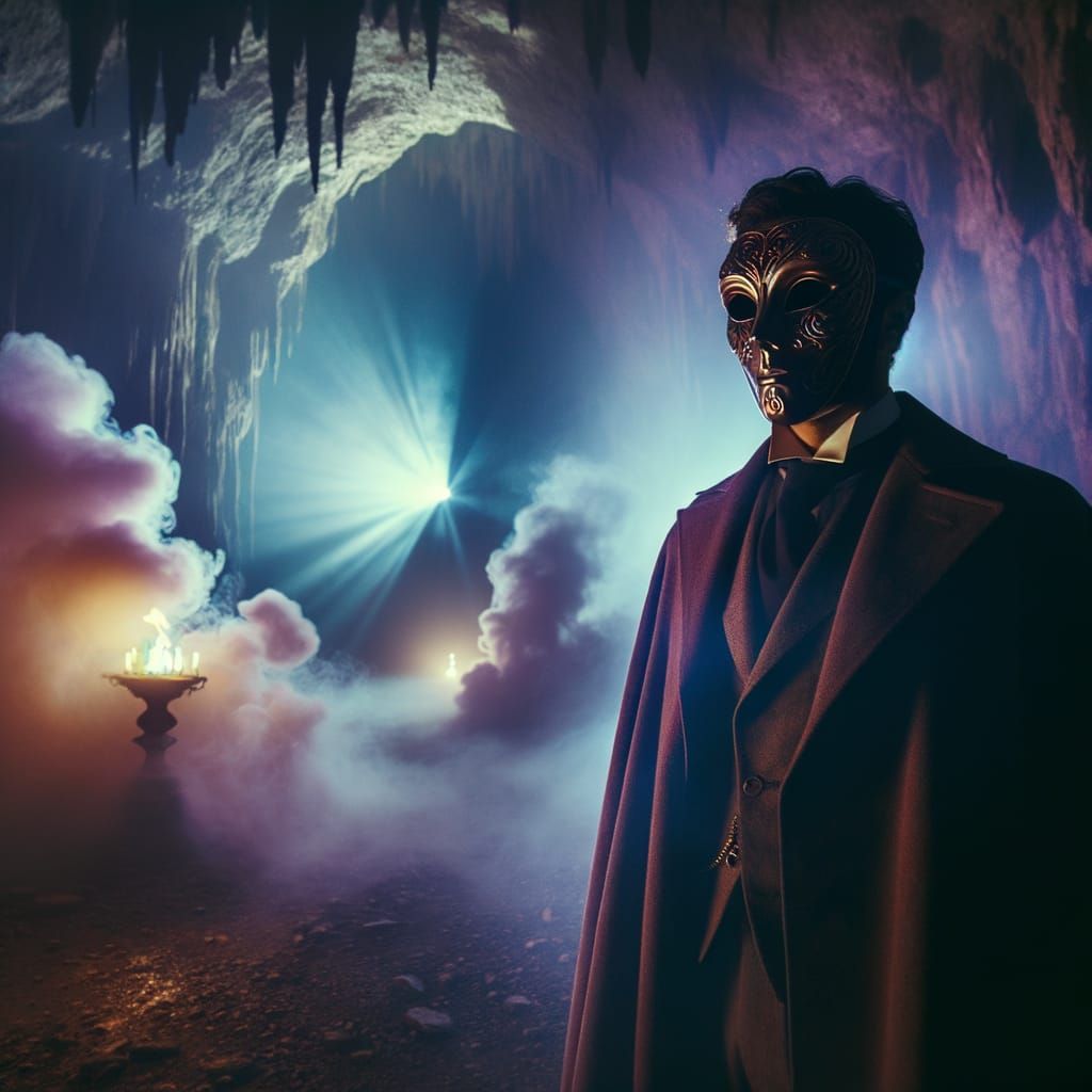 A captivating image of a masked man in front of a smoke-filled cave, bathed in moonlight with a purple tint. The scene is reminiscent of a cinematic still with a vintage film aesthetic.