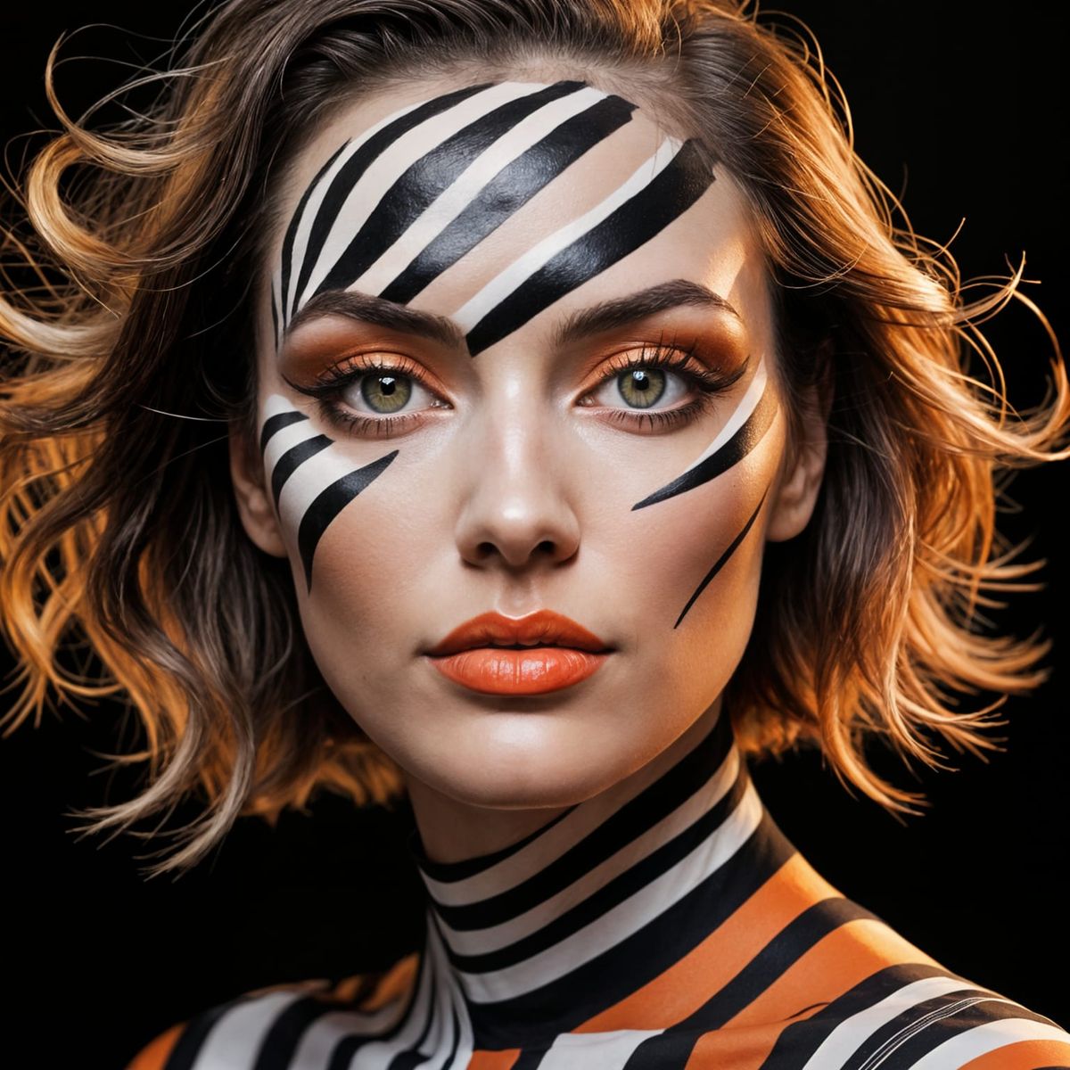 A striking portrait of a woman with vibrant makeup and a bold striped pattern. The image emphasizes exaggerated beauty with intense colors against a swirling monochromatic backdrop.
