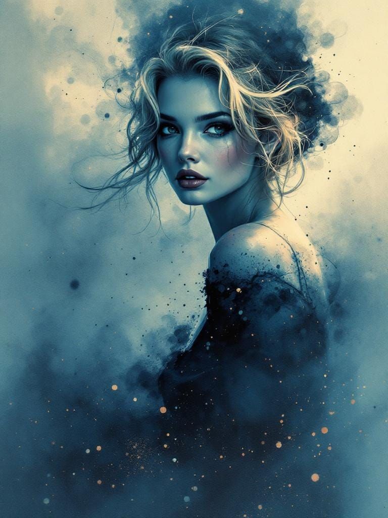 This image shows a full-body portrait of a blonde woman reminiscent of 1950s pin-up art, rendered in a surreal watercolor style. The artwork features atmospheric effects, fluid ink textures, and chiaroscuro lighting.