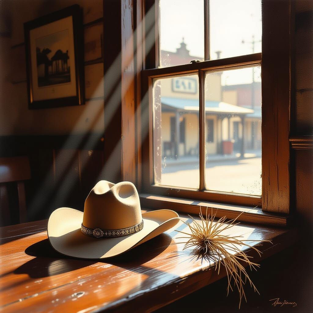 A lone cowboy hat with silver filigree rests on a dusty saloon counter, depicted in a traditional Chinese watercolor style with evocative brushstrokes and a serene atmosphere.