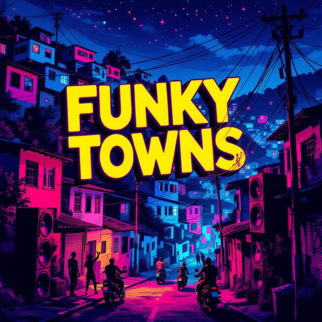 A striking picture of a Brazilian favela at night, alive with music and neon lights. The scene features colorful houses, motorcycles, and dancing silhouettes under a web of power lines in a raw, gritty style.