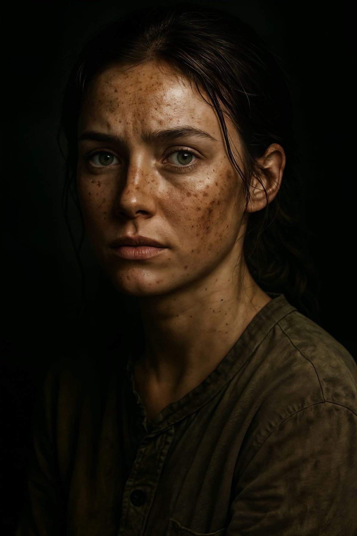 A striking picture of a determined young woman who has been through hardship. Her face is smudged with dirt, and she wears a rugged shirt, but her green eyes show resilience. The image uses studio lighting.
