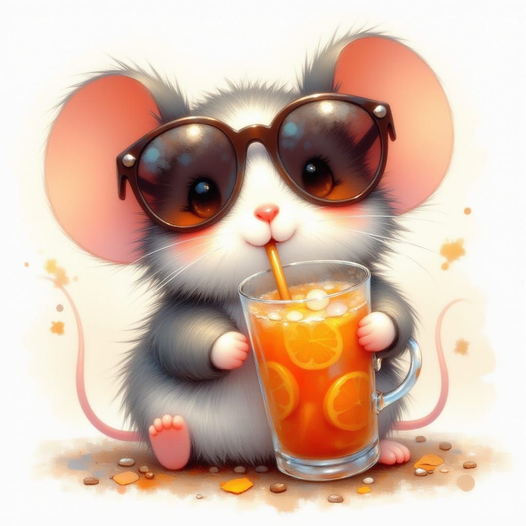 This image shows a charming mouse in vintage sunglasses enjoying an iced orange drink. The artwork features expressive brushstrokes and warm earthy tones, evoking a cozy cafe atmosphere.