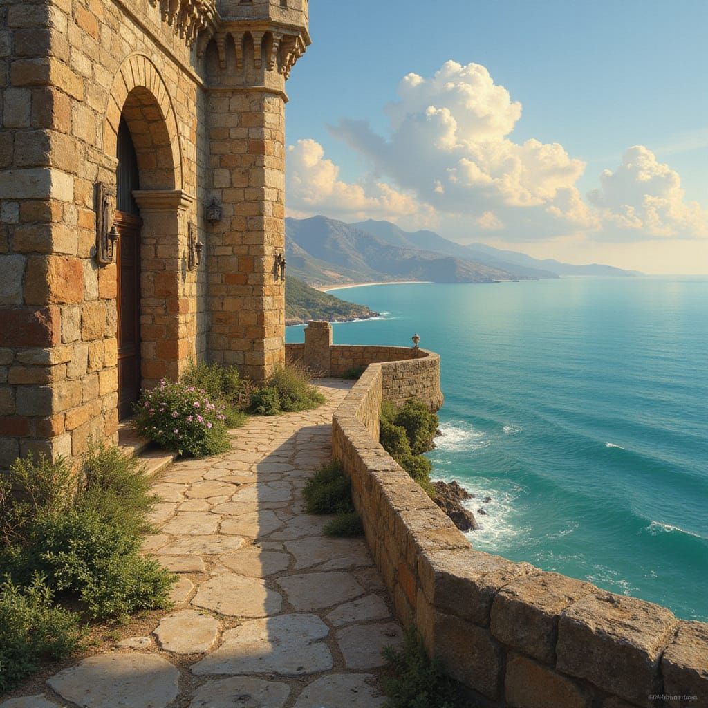 This image shows a breathtaking vista of a castle's battlements overlooking a vast turquoise sea, with warm golden light and intricate architectural details, reminiscent of a classic romantic era landscape.
