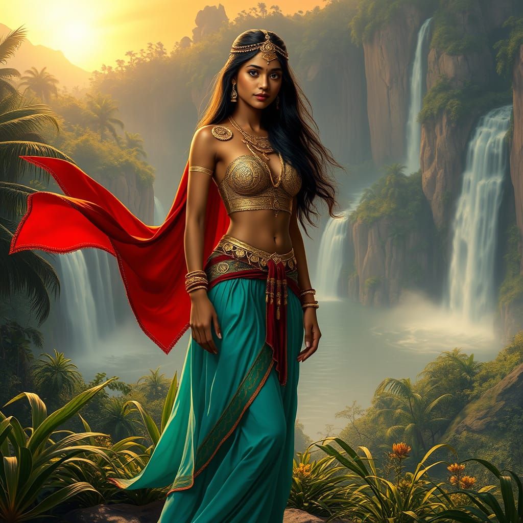This image shows a slender Tamil woman in a tropical paradise. She wears an elaborate gold outfit with a turquoise skirt and red cape, complemented by ornate gold jewelry and a serene waterfall backdrop.