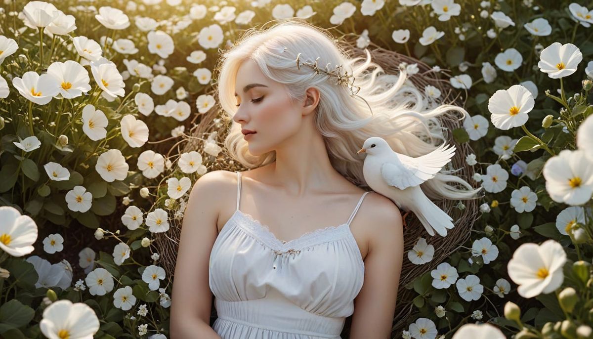 A whimsical image of a young woman with bird's nest hair and a dove, in a field of white pansies. The fantasy art is rendered in pastel colors with soft focus and delicate lines.