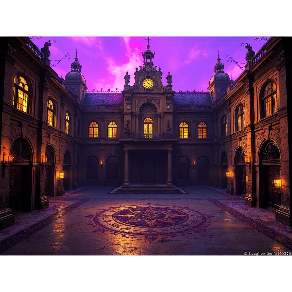 This image shows a hyperdetailed dark fantasy concept art piece of the Palazzo delle Poste. It features dynamic, volumetric lighting and deep colors in an Art Nouveau aesthetic, evoking a mysterious, abandoned atmosphere.