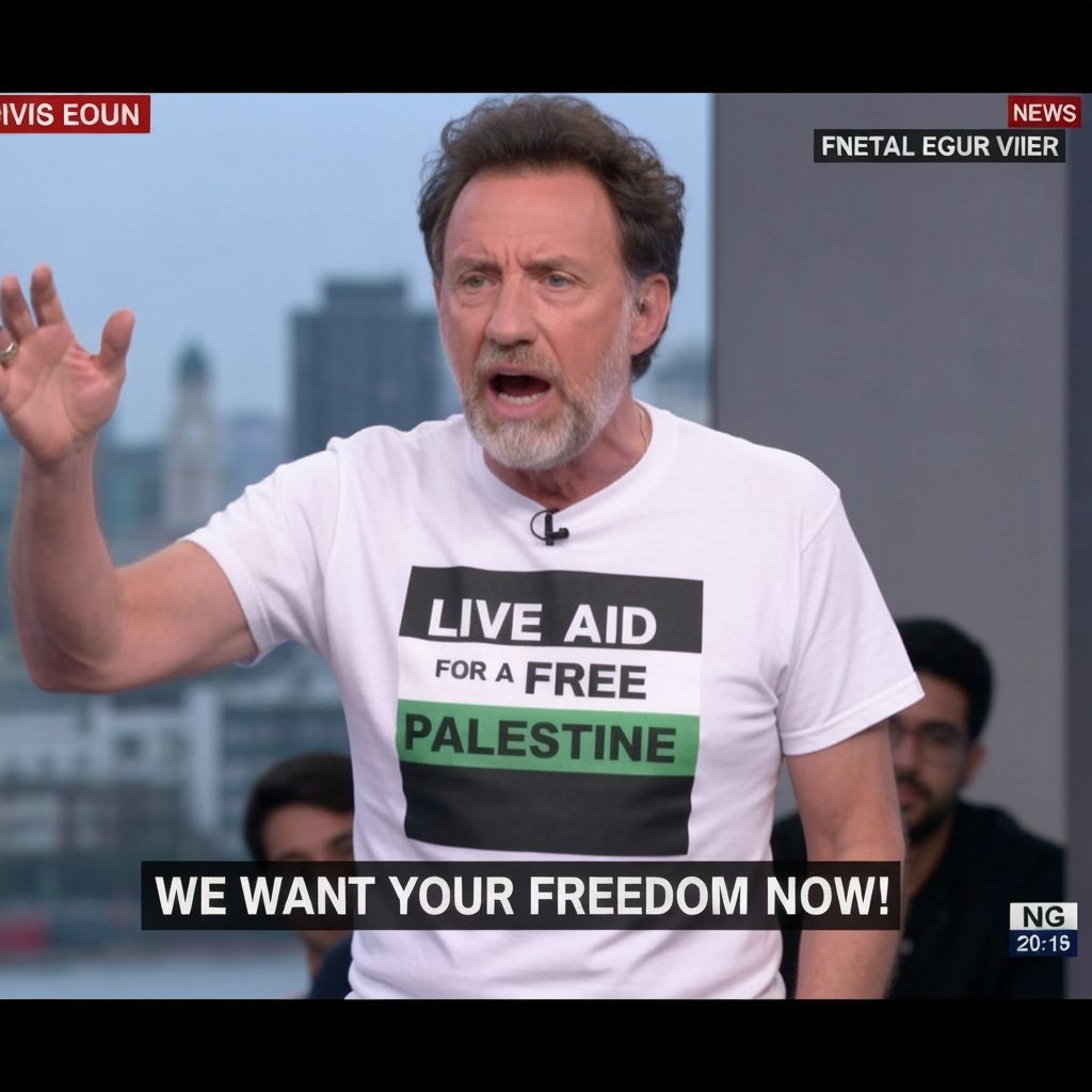 This image shows Bob Geldof wearing a Free Palestine t-shirt during a television interview. The screen capture includes news subtitles demanding freedom.