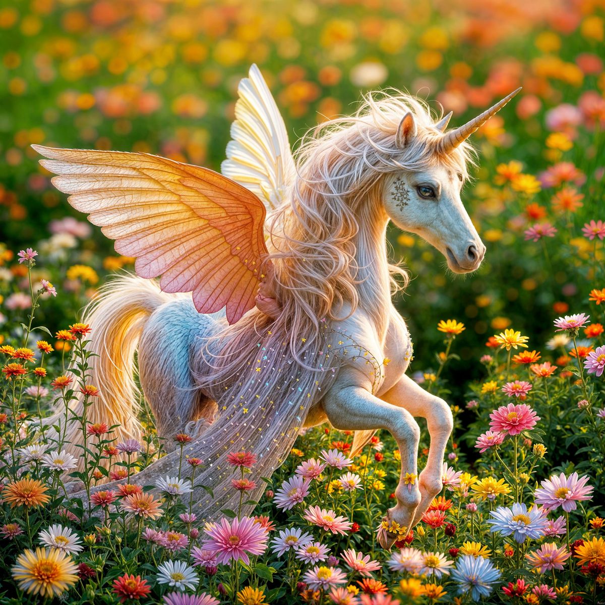 This image shows a winged unicorn in a vibrant flower field. The scene is hyperrealistic with intricate details, high contrast, and atmospheric lighting. The artwork is beautifully shot with a cinematic feel.