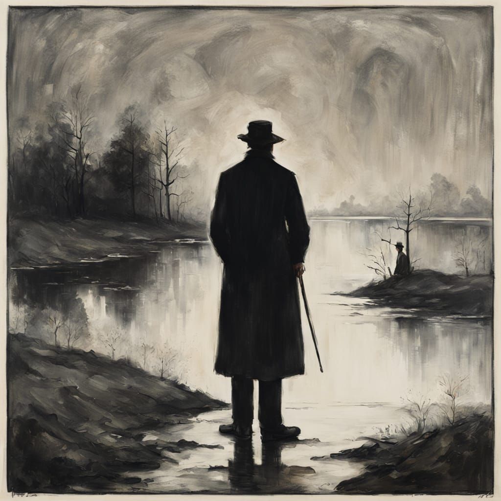 This image captures a moody, introspective portrait of a single person. It is rendered in an atmospheric Symbolist style reminiscent of Edvard Munch's work.