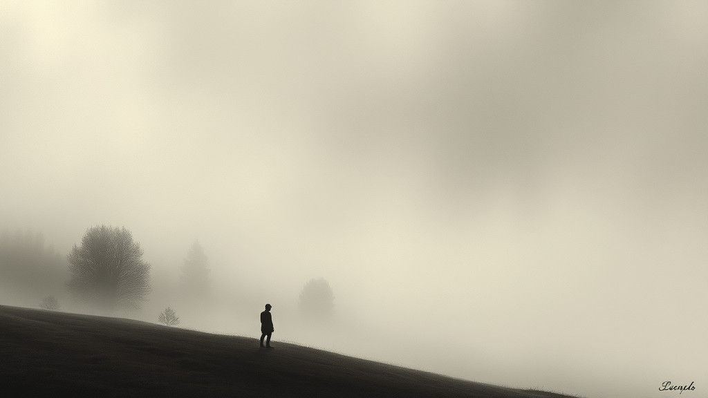 A misty landscape featuring a solitary figure in the distance. The artwork evokes a dreamlike quality with hyperrealistic textures, rich colors, and nuanced shading, rendered as an oil painting.