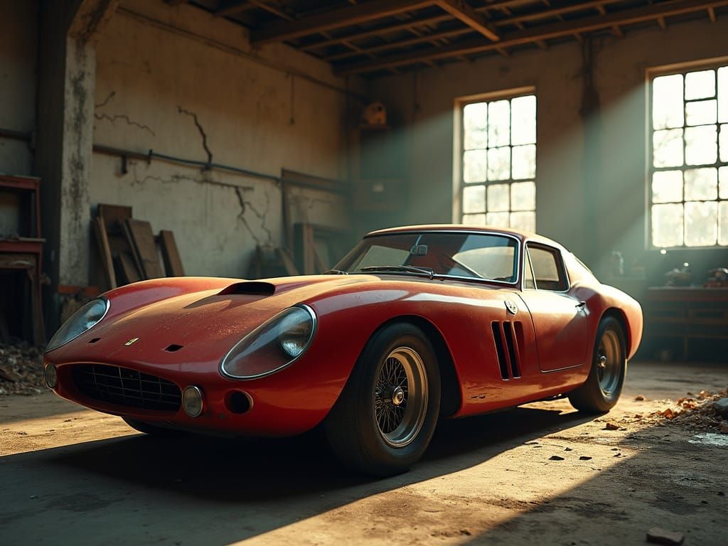 A photorealistic image of a classic Ferrari 250 GTO, parked in a nostalgic 1960s garage, with warm, cinematic lighting and intricate details, evoking the feel of a high-end film still.