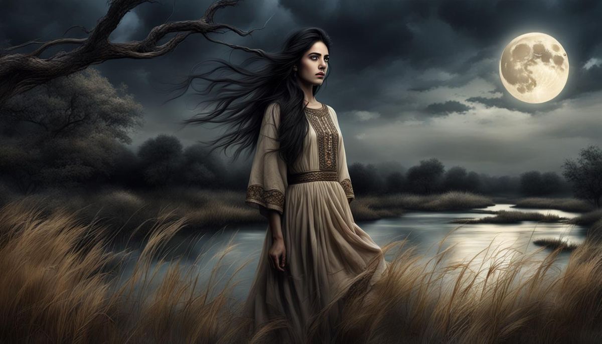 A hyperrealistic image of a sad, young Pashto woman with striking black eyes and long black hair. She wears a beige dress by a river at night, with dry trees and a dramatic, fantastical ambiance.