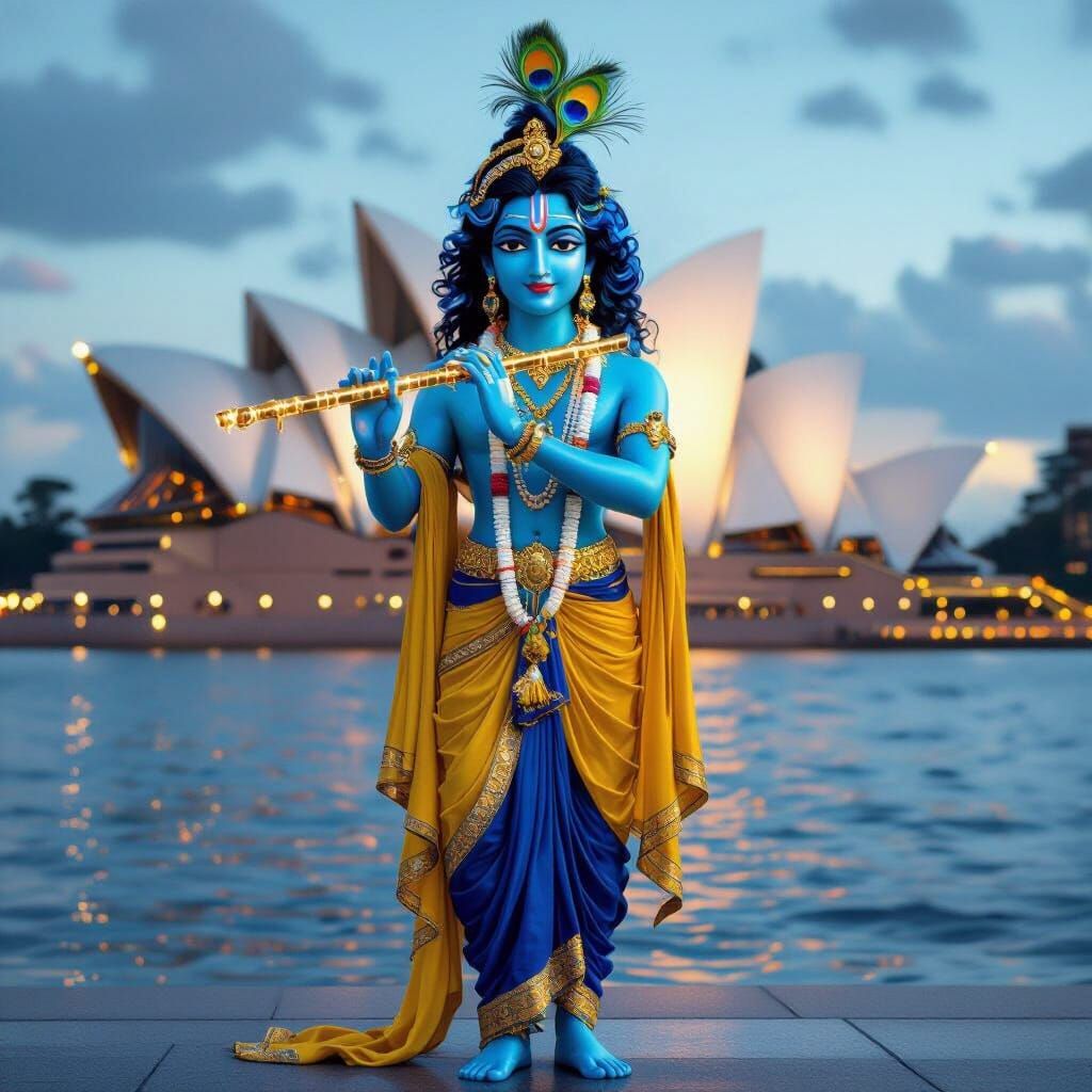 This image shows Lord Krishna in Sydney, reimagined with street art-inspired attire, near Sydney Harbour. The artwork features a vibrant fusion of modern and traditional elements in a photorealistic style.