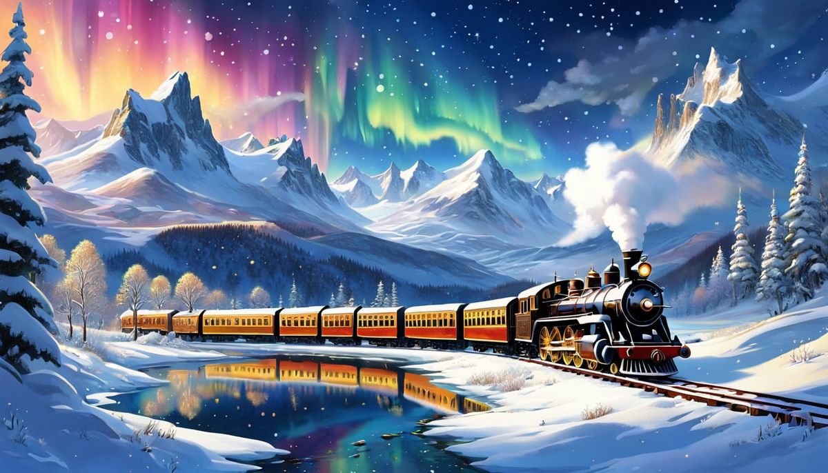 This image shows a detailed winter landscape with a black and golden steam train. Colorful aurora, stars, and reflections enhance the fairy-tale scene.