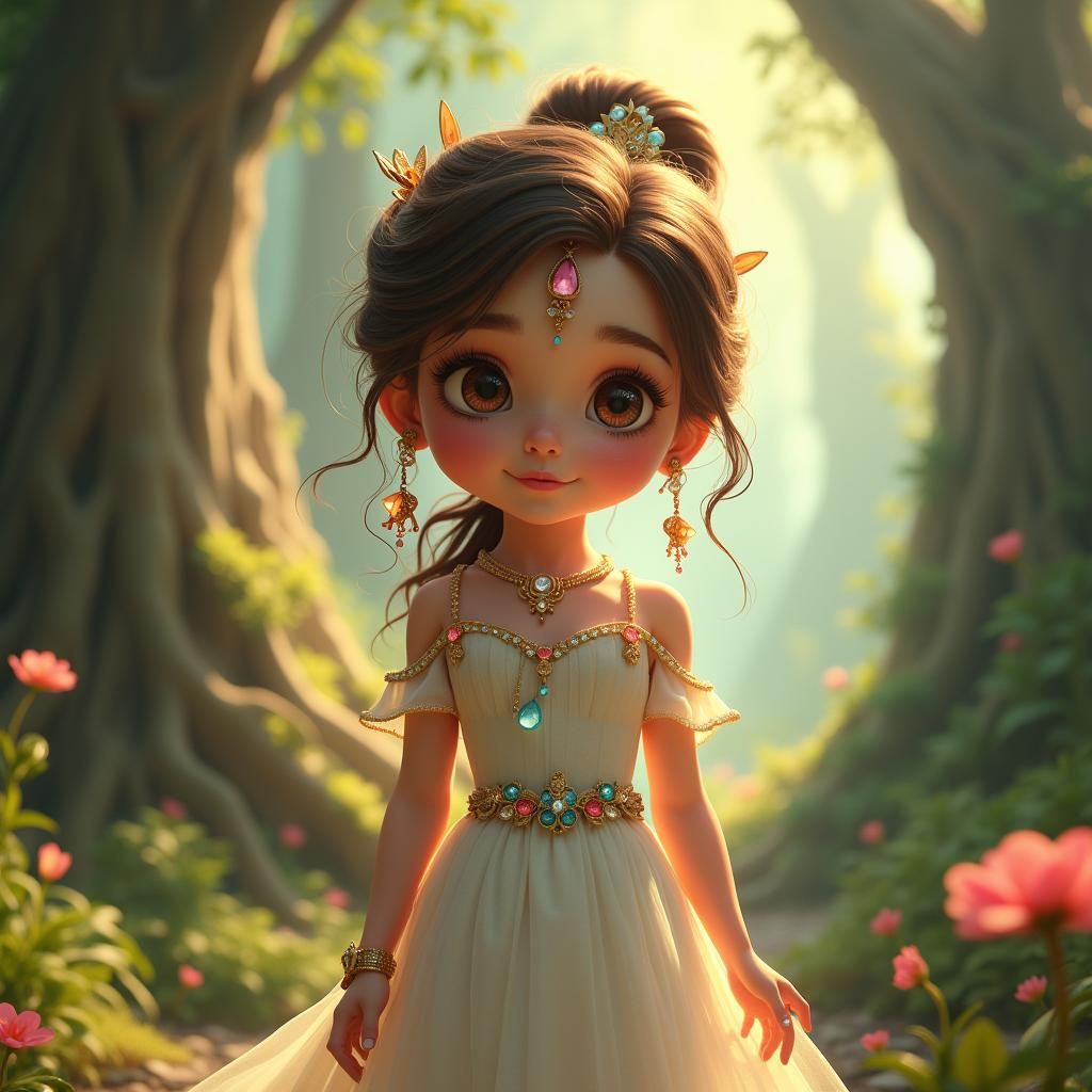 A digital painting of a girl with brown hair and eyes in a flowing white dress. The scene features a vibrant, mystical environment with soft lighting, reminiscent of fantasy concept art.