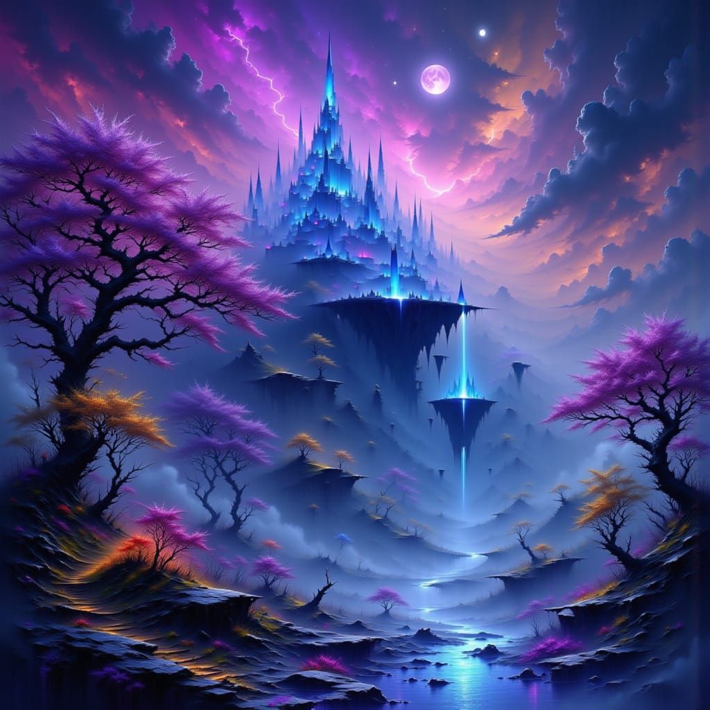 This image showcases a grand, enchanted castle made of solidified moonlight, set against a swirling galaxy. Crystalline trees and ethereal mist create a serene, high-fantasy scene.