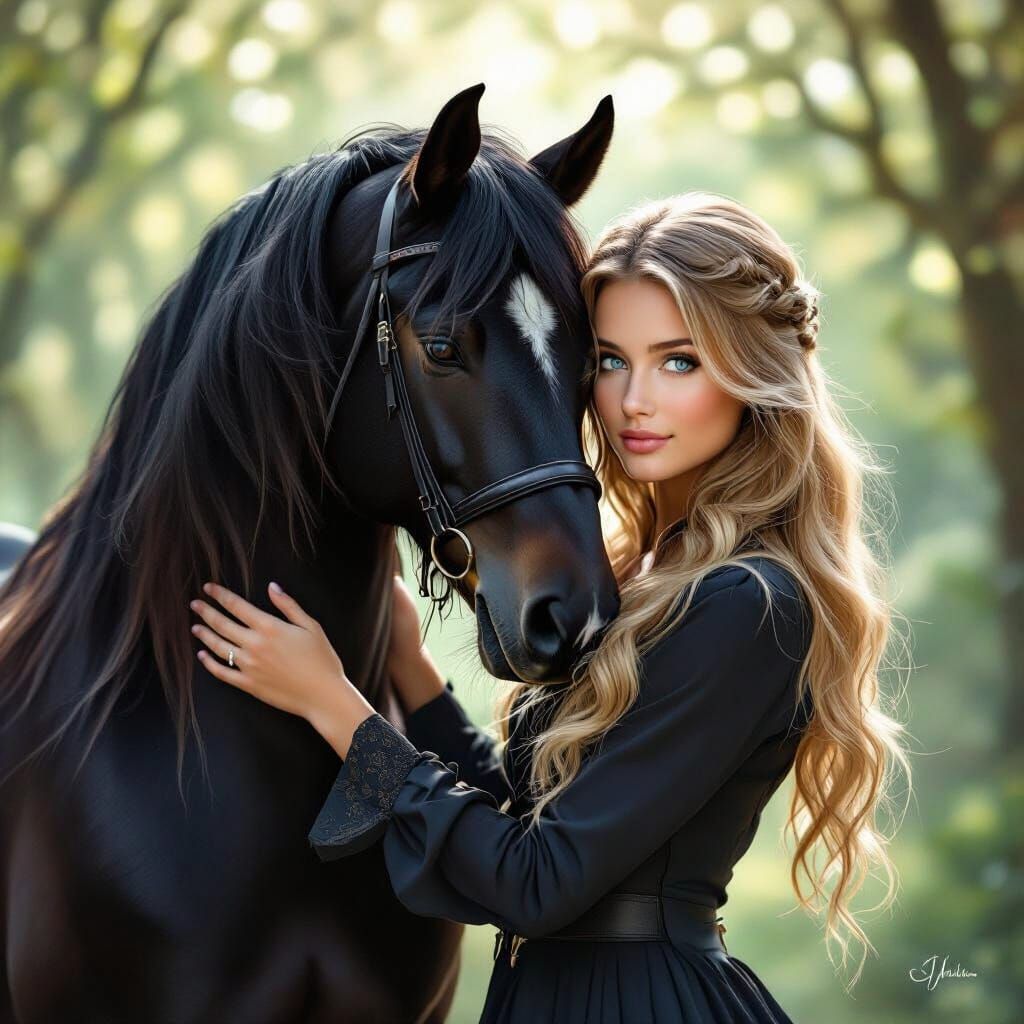This image shows a black Friesian horse and its rider in a serene forest glade, capturing a moment of deep connection. Rendered in a romantic realism style with soft, painterly brushstrokes.