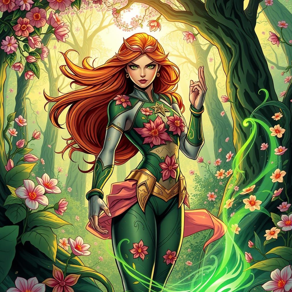A dynamic female superhero harnesses her plant powers amidst a vibrant spring forest, surrounded by blooming flowers, towering trees, and swirling leaves, with an air of mystical energy and dramatic flair.