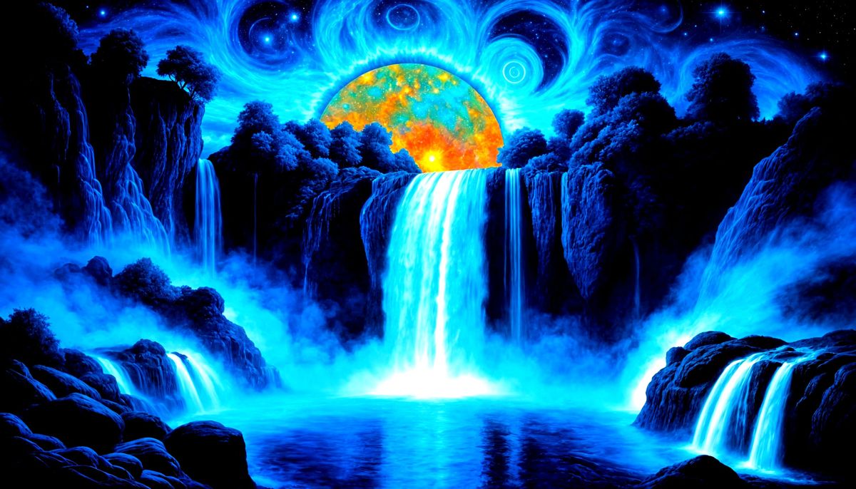 A vibrant image of a waterfall flowing into a pool beneath a cosmic sky. The scene features nebulae and celestial bodies with psychedelic colors, rendered as a hyperdetailed charcoal drawing with cosmic art influences.