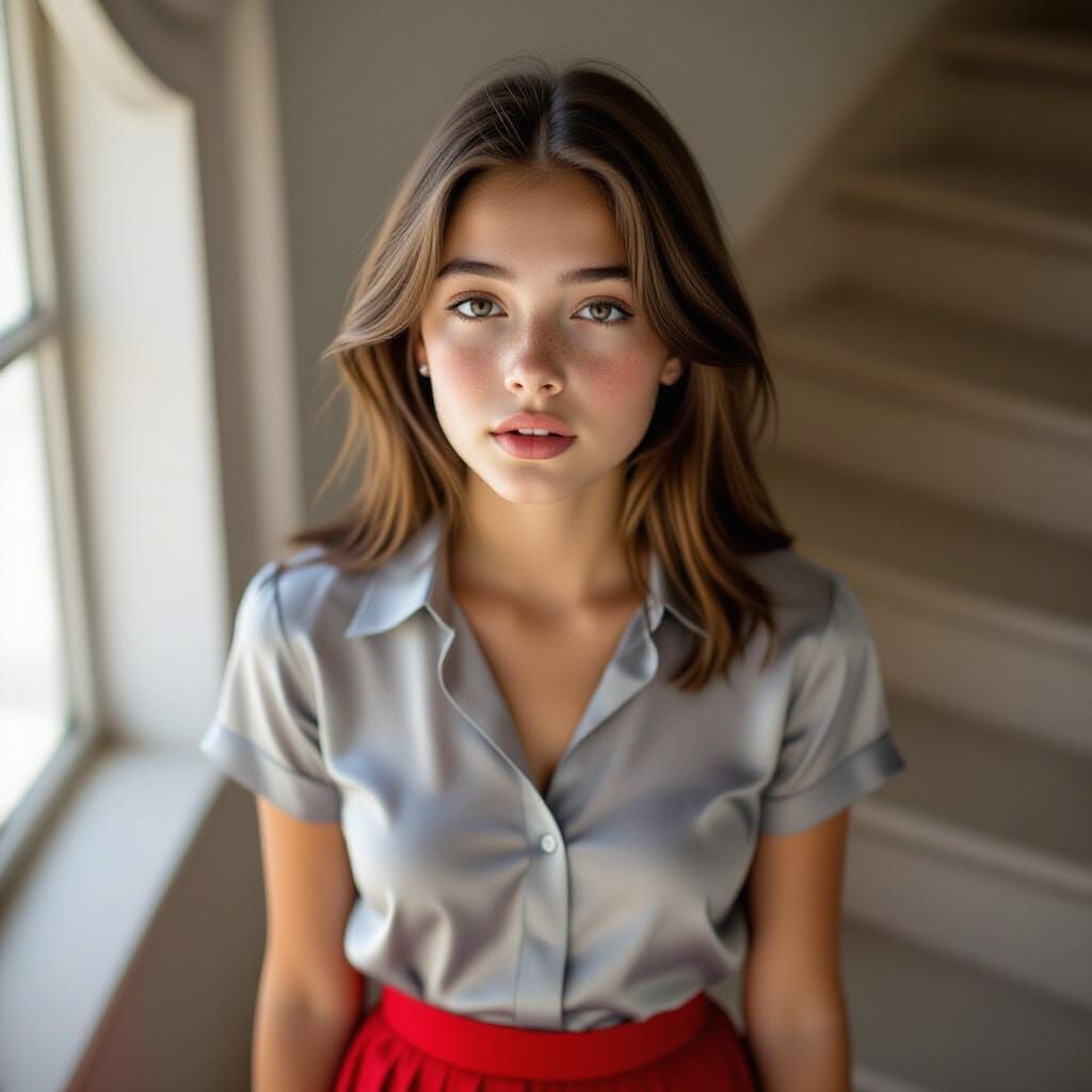 This image shows a yawning teenage girl with freckled skin walking up stairs. She has shoulder-length dark hair and wears a grey satin shirt and red skirt. The natural, warm lighting creates an inviting, photorealistic style.