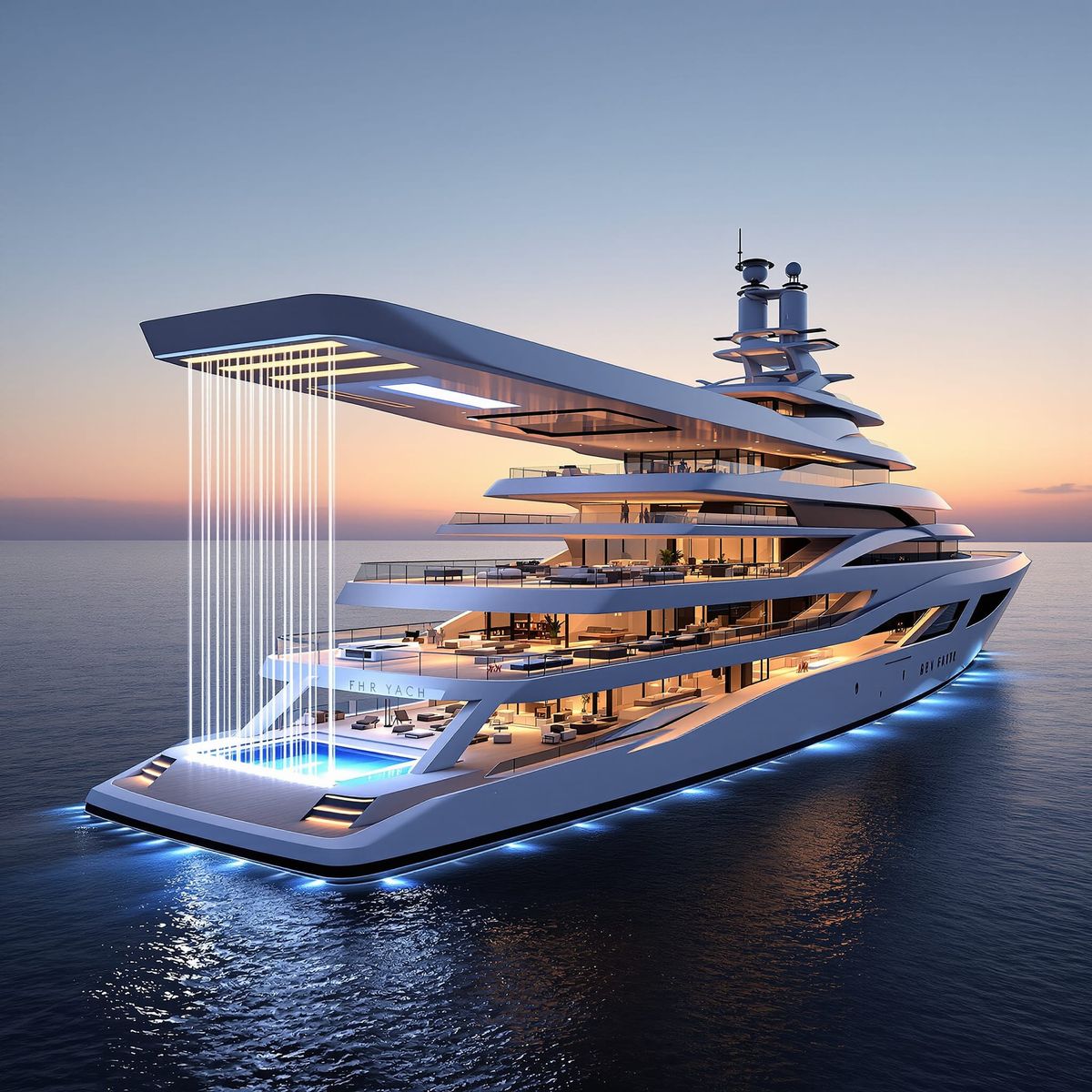 A luxurious modern superyacht at sunset, featuring a dramatic overhanging deck with a cascading LED light waterfall. Captured with sleek architectural photography and dramatic lighting.