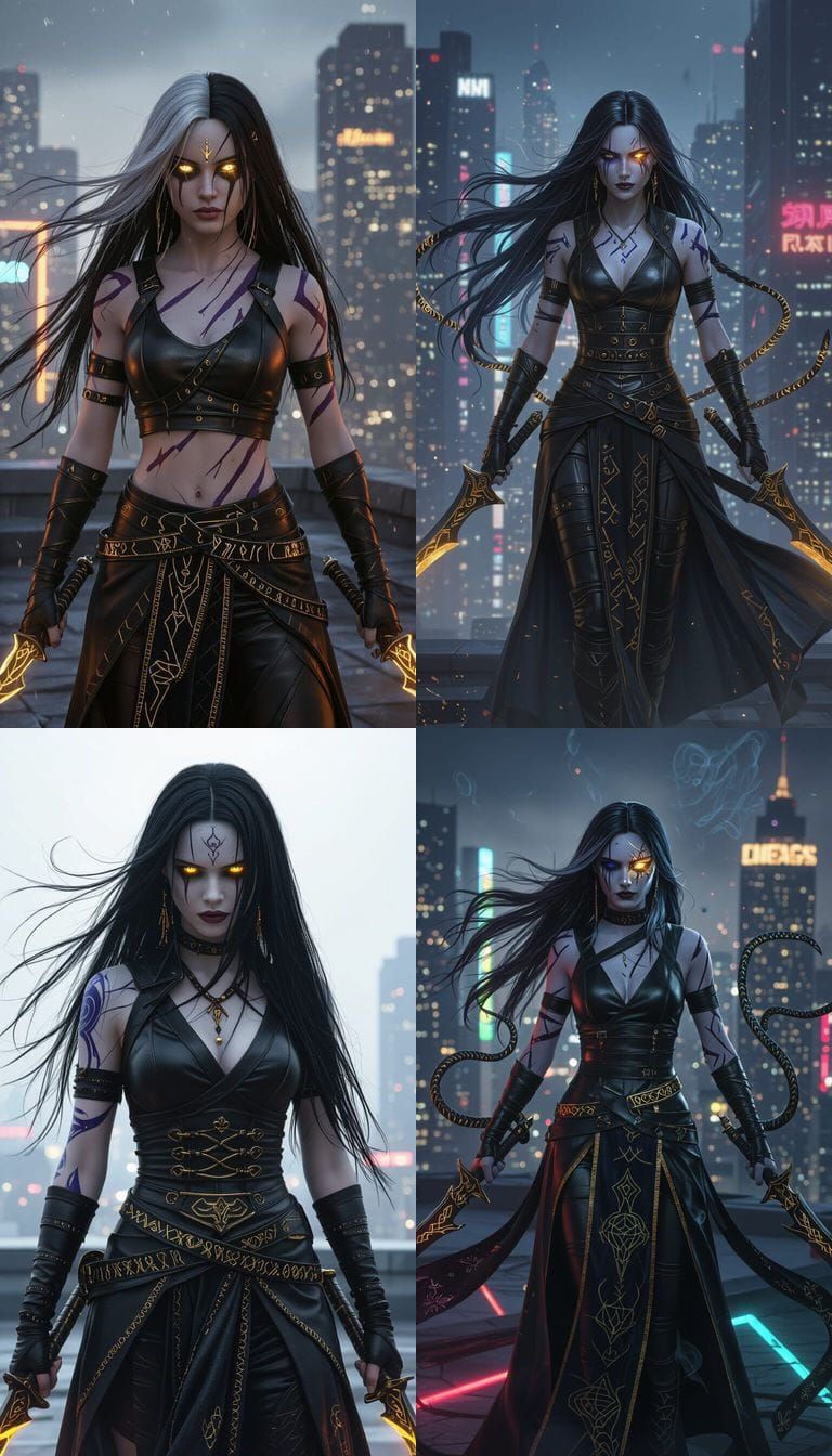 This image showcases a terrifying woman with indigo skin, gold and void eyes, and sigil scars. She wields glowing shadow blades on a neon rooftop, embodying deadly, alluring, apocalyptic power in a hyper-detailed, cinematic style.