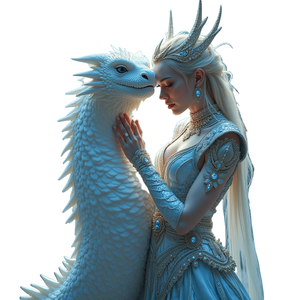 A striking picture of a dragon goddess with a white and blue moon dragon. She wears white, gold, and blue armor with diamond and ruby jewelry, set against a mystical temple backdrop as digital art.