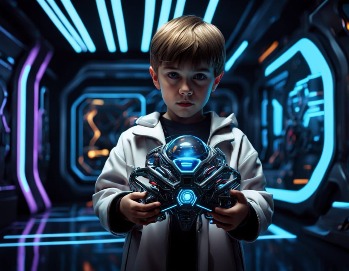 This image shows a child holding a sci-fi toy in a futuristic room. The digital art features glowing neon lines, reflections on metallic surfaces, and high contrast cinematic lighting.